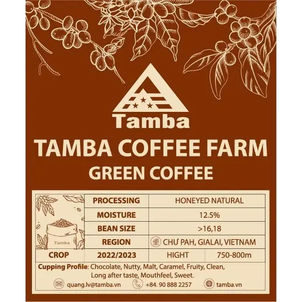 PHƯƠNG PHÁP LÊN MEN TRONG TRÁI TỰ NHIÊN HONEYED NATURAL. THỜI GIAN PHƠI, KIỂM SOÁT PH, ĐÂY CÓ THỂ NÓI LÀ 1 P HƯƠNG PHÁP ĐẶC BIỆT ĐỐI VỚI TAMBA COFFEE . SẢN PHẨM HOÀN TOÀN HÁI CHÍN 100% BẰNG TAY , LỰA TỈ MĨ TỪNG HẠT CÀ PHÊ TƯƠI . VỚI ĐỘ NGỌT 25% . THỜI GIAN PHƠI KÉO DÀI 25-30 NGÀY. TRÊN GIÀN PHƠI VÀ BẠT. KẾT HỢP 2 CÔNG ĐOẠN. CUPPING PROFILE: CHOCOLATE, NUTTY, MALT, CARAMEL, FRUITY, CLEAN, LONG AFTER TASTE, MOUTHFEEL, SWEET